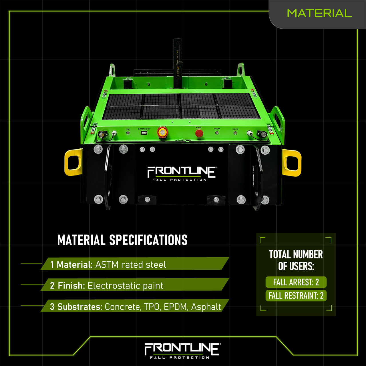 Frontline Introduces the patent pending Commando Tank, the most innovative and revolutionary non-penetrating fall arrest cart in the industry! This OSHA compliant cart is engineered and designed to enhance safety and efficiency on the jobsites with a user capacity for up to 4 users, 2 in fall arrest and 2 on fall restraint.
