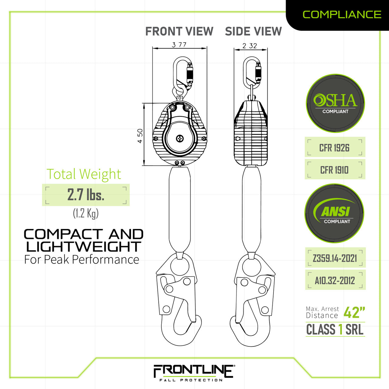 Manufactured to exceed expectations and tested by an independent third party ISO 17025:2017 accredited lab, these SRL’s are built rugged, built to last and built to give users the consumer confidence needed to perform their jobs with peace of mind when fall protection is required.