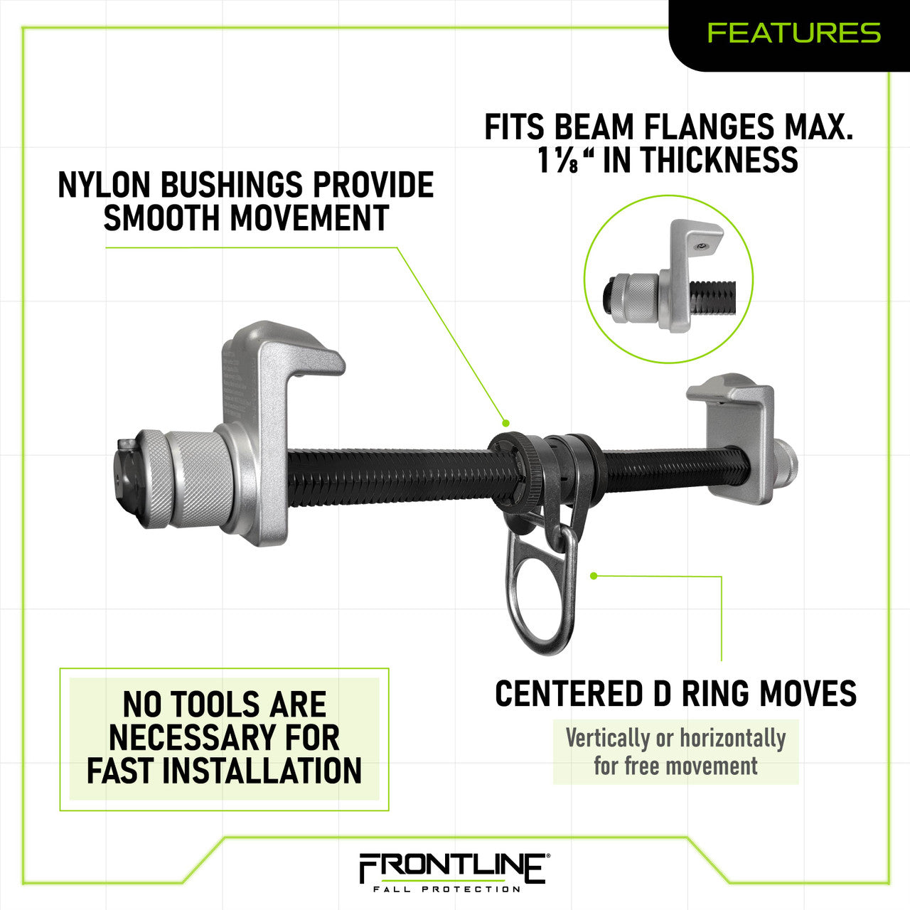 The aluminum I-beam slider anchor is easy to place, install and can be quickly removed to go onto the next location. The anchor nylon bushings and ball bearings make it easy for the anchor to slide on the beam flanges while trailing the worker for added safety and productivity.