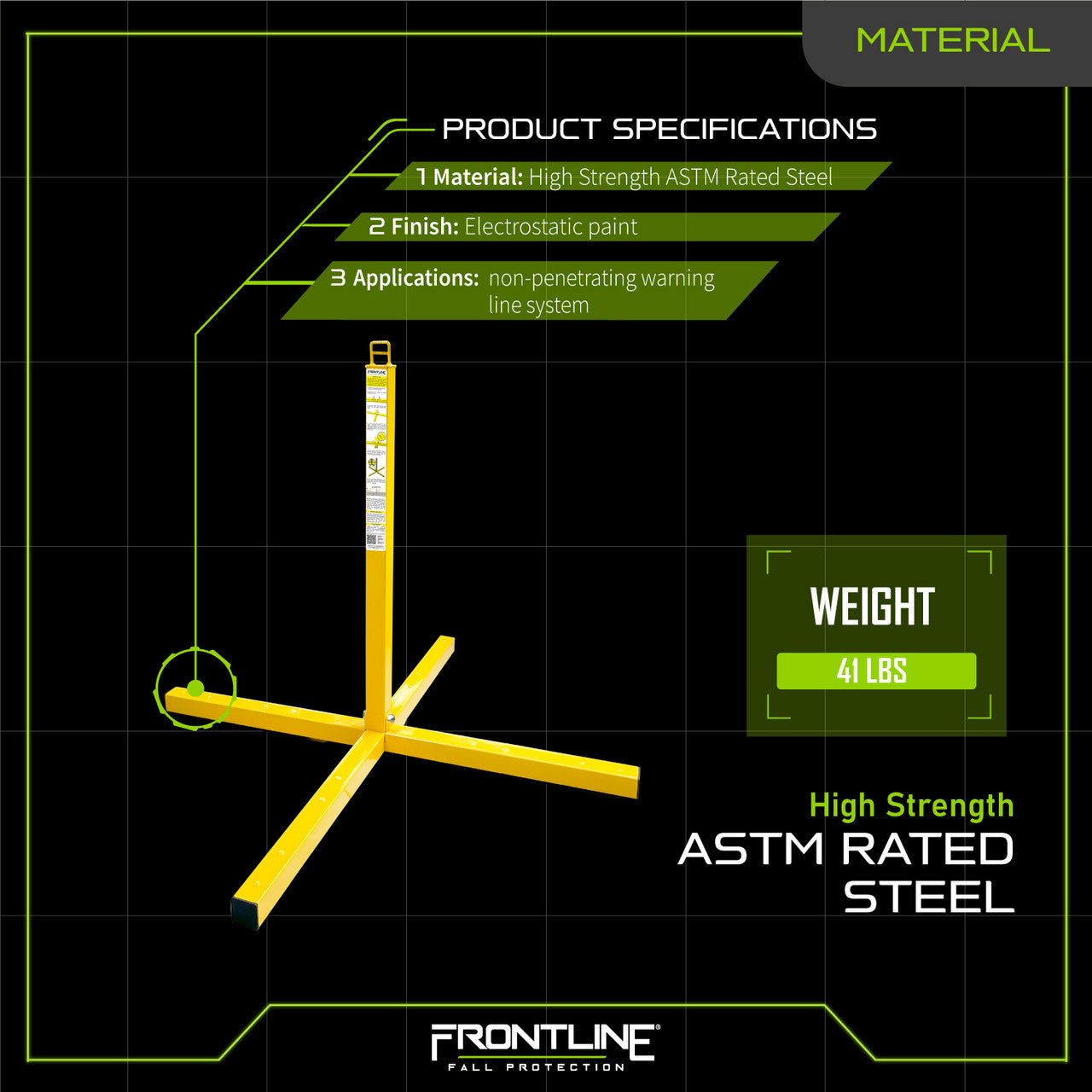 The Frontline Warning Line System is designed to provide a highly visibility barrier to alert workers of fall hazards on a roof, working in unprotected edges or other general restricted areas. The Frontline warning line systems is powder coated safety yellow made up of a post stanchion, two leg supports with rubber padding to protect the finished substrates and to provide better stability and with a warning line connection point on the top of the stanchion.